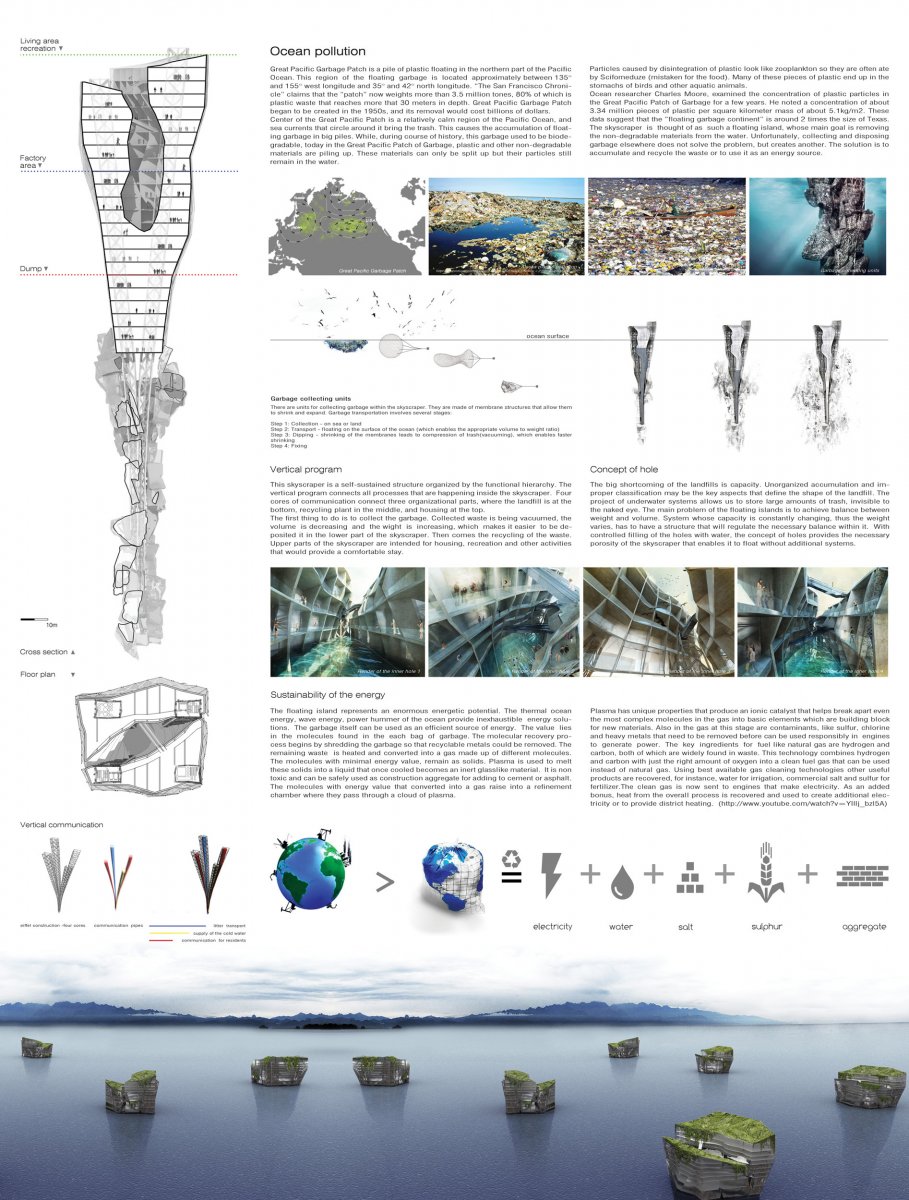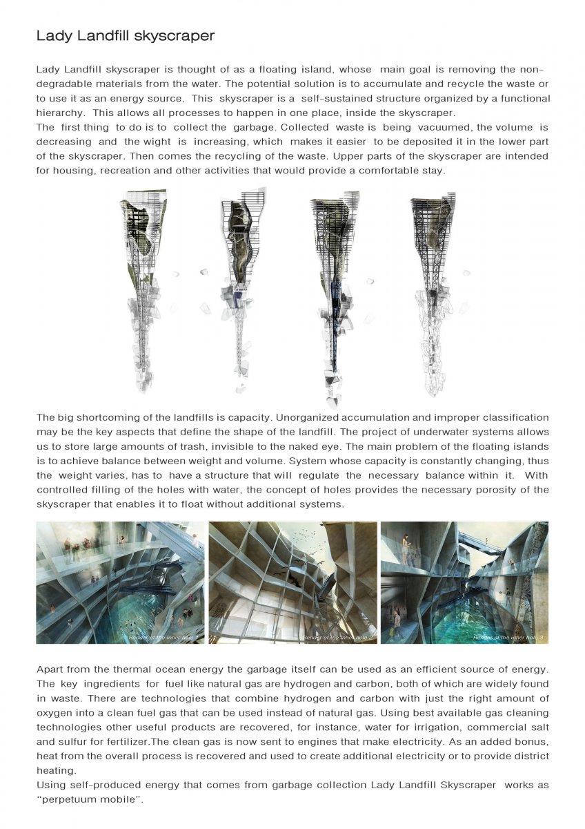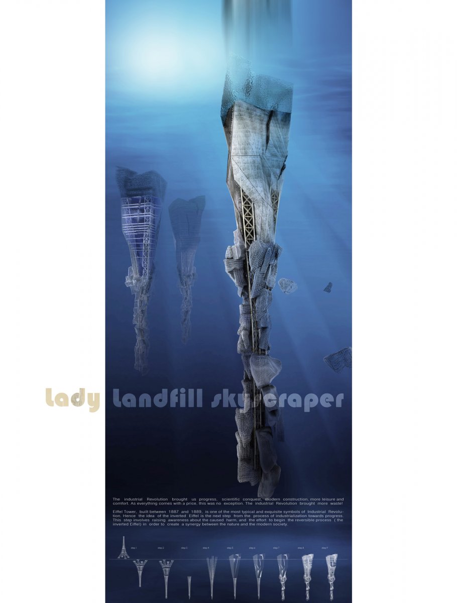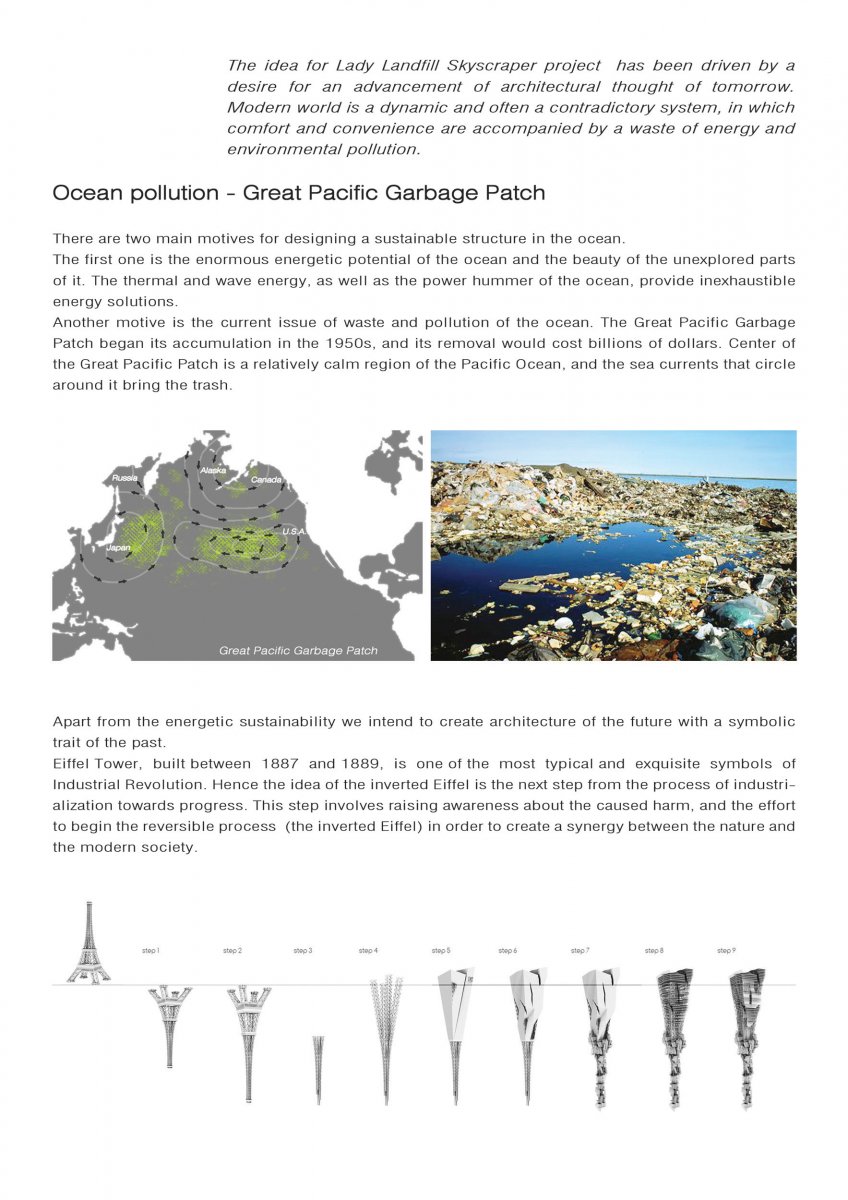 Ideja projekta Lady Landfill Skyscraper vođena je težnjom ka uspostavljanju veze izmedju savremenog društva i životne sredine. Civilizacijski razvoj je uspostavio neke nove uslove i vrednosti koji su tokom poslednjih decenija doveli do ireverzibilnih akcija i neželjenih efekata napretka, što u prvi plan stavlja globalno zagađenje životne sredine, i ogromne gubitake energije. Kao jedan od najvećih problema zagađenosti sredine, predstavlja "Great Pacific Garbage Patch", plutajuća deponija plastičnog otpada, koja se formirala u oblasti Severnog Pacifika. Istražujući problem plastičnog otpada na površini okeana, osnovna ideja projekta je formiranje reciklažnog centra koji će služiti za prikupljanje, deponovanje i reciklažu plutajućeg otpada. Struktura reciklažnog centra predstavljena je u vidu obrnutog nebodera, koji ponire u dubinu, a koji je organizovan prema vertikalnoj hijerarhiji, gde se deponija otpada nalazi na dnu , reciklažni centar u sredini, a život ljudi je organizovan na vrhu, u delu strukture koji pluta iznad površine vode.